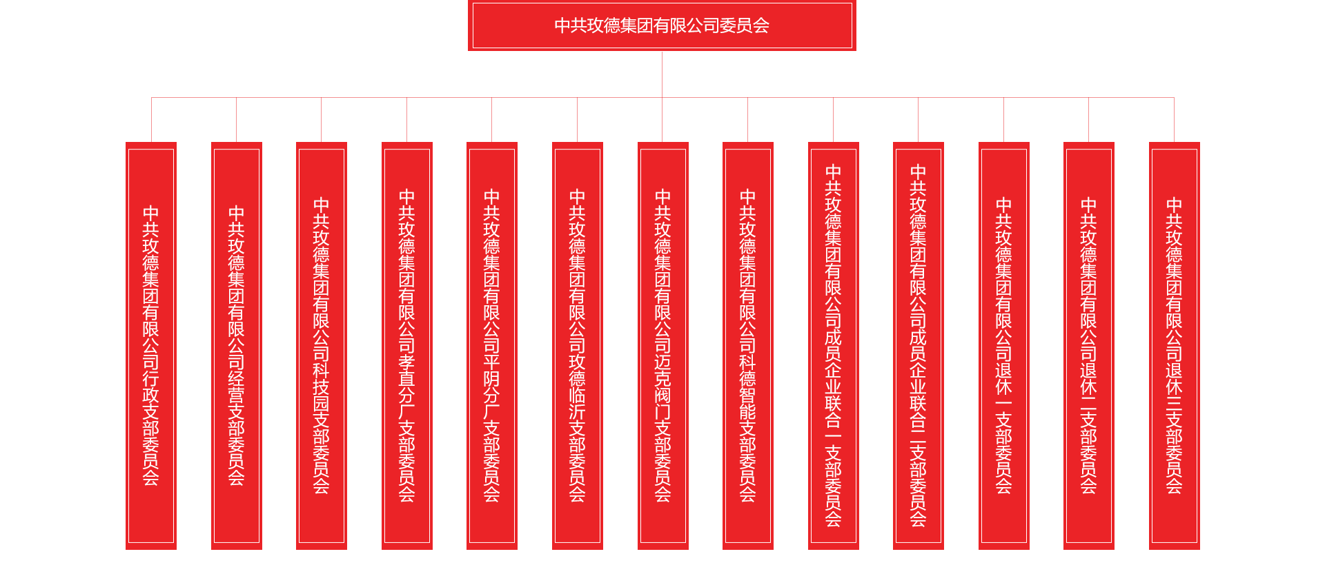 1.中共玫德集團(tuán)有限公司行政支部委員會 2.中共玫德集團(tuán)有限公司經(jīng)營支部委員會 3.中共玫德集團(tuán)有限公司科技園支部委員會 4.中共玫德集團(tuán)有限公司孝直分廠支部委員會 5.中共玫德集團(tuán)有限公司平陰分廠支部委員會 6.中共玫德集團(tuán)有限公司玫德臨沂支部委員會 7.中共玫德集團(tuán)有限公司邁克閥門支部委員會 8.中共玫德集團(tuán)有限公司科德智能支部委員會 9.中共玫德集團(tuán)有限公司成員企業(yè)聯(lián)合一支部委員會 10.中共玫德集團(tuán)有限公司成員企業(yè)聯(lián)合二支部委員會 11.中共玫德集團(tuán)有限公司退休一支部委員會 12.中共玫德集團(tuán)有限公司退休二支部委員會 13.中共玫德集團(tuán)有限公司退休三支部委員會