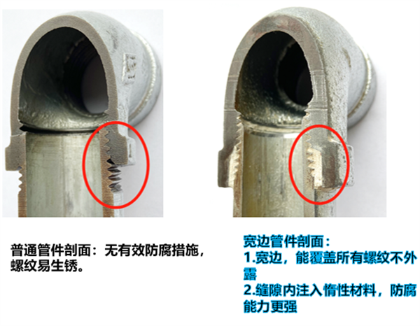 區(qū)別于傳統(tǒng)管件,玫德寬邊瑪鋼燃?xì)夤芗捎猛黄菩缘膶掃厴?gòu)造,能將所有螺紋緊密覆蓋,使其完全不外露。這一設(shè)計(jì)從根本上消除了因螺紋裸露,在長期使用過程中可能因磨損、松動(dòng)而引發(fā)燃?xì)庑孤┑娘L(fēng)險(xiǎn)。對比普通燃?xì)夤芗B接時(shí),鋼管會(huì)有 2 - 3 扣螺紋暴露在外的情況,玫德管件的安全性得到了質(zhì)的提升。