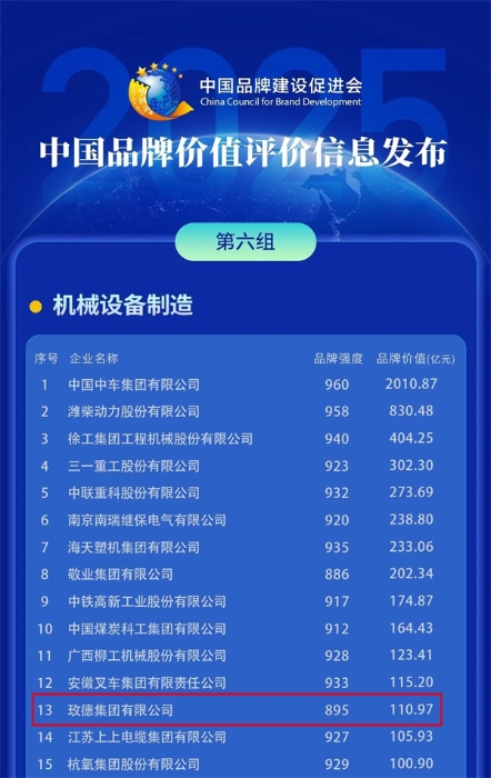玫德集團憑借卓越的品牌實力和行業(yè)影響力,以110.97億元的品牌價值登榜“機械設備制造組”榮譽榜,較2024年的102.04億元增長8.93億元,彰顯了集團持續(xù)創(chuàng)新的發(fā)展韌性和品牌價值的強勁攀升。