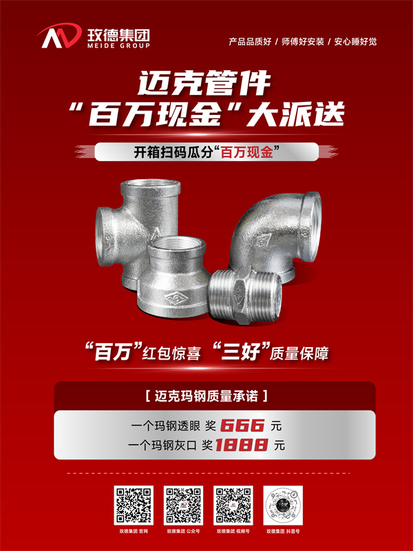 即日起,凡購買玫德集團(tuán)邁克牌瑪鋼、溝槽管件,有機(jī)會(huì)參與開箱掃碼瓜分 “百萬現(xiàn)金” 活動(dòng)!