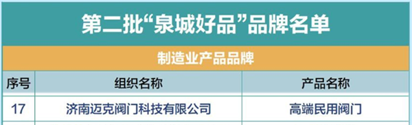 玫德集團旗下邁克閥門榮膺"泉城好品"稱號