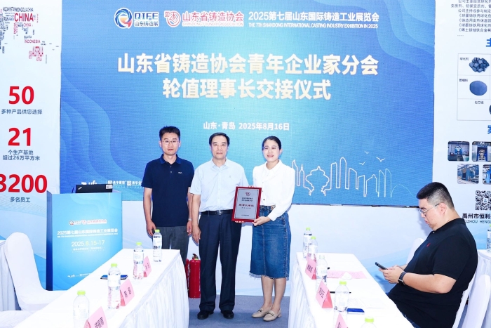 濟(jì)南科德智能科技有限公司總裁劉少云參加山東省鑄造協(xié)會青年企業(yè)家分會第四次代表會議,并當(dāng)選為本屆輪值理事長,展現(xiàn)了玫德集團(tuán)在行業(yè)中的領(lǐng)導(dǎo)地位。