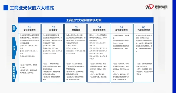 對(duì)于新能源的崛起,孔主席分享了玫德集團(tuán)近些年光伏新能源的實(shí)踐,并深入淺出的舉例介紹了對(duì)鑄造企業(yè)的實(shí)際經(jīng)濟(jì)價(jià)值,以及玫德新能源在工商業(yè)提供的六大定制化解決方案。